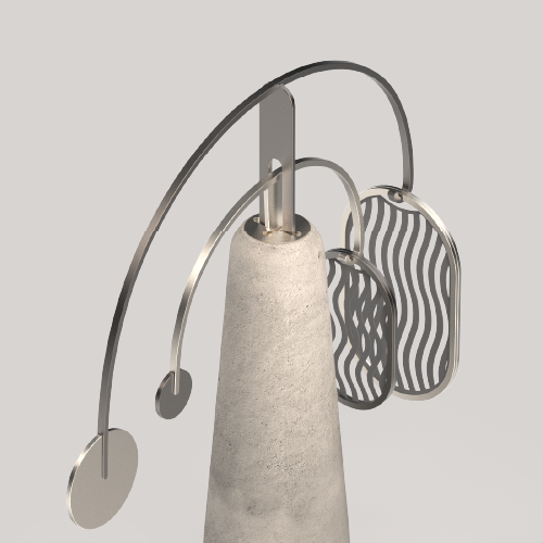 본체 내부의 조명이 프레임을 향해 빛을 비추고, 한쪽 암(arm)이 천천히 좌우로 움직이며 두개의 패턴이 겹쳐지는 모아레 그림자 효과를 만들어냅니다.