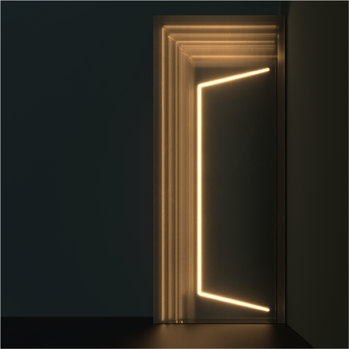 어두운 방에서 문을 살짝 열었을 때, 문틈으로 새어 들어오는 한 줄기 빛이 주는 심리적인 안도감과 위로를 담았습니다. 틈 형태의 미니멀한 조형물 안에 인피니티 미러를 적용하여, 좁은 빛줄기가 마치 끝없이 이어지는 공간으로 확장되는 듯한 시각적 착시를 일으킵니다.
