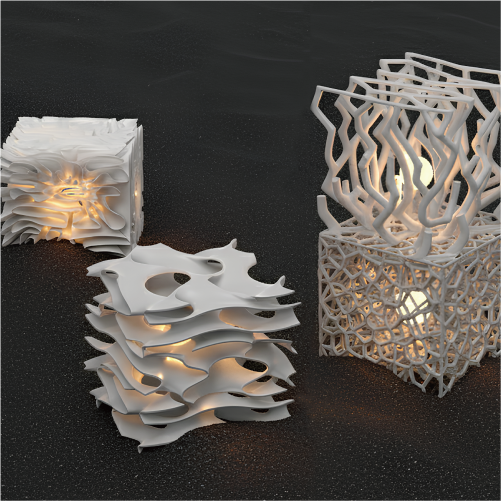 폐기물 압축기에 의해 압축된 큐브형태로 백화된 산호를 형상화한 조명입니다. 쓰레기가 압축기에 눌려 네모진 잔해가 되듯, 그 틀 안에 갇혀 사라지는 생명을 표현합니다. 이 작품을 통해 우리의 편안함과 번영은 무엇을 희생시키는지 묻고자 합니다.